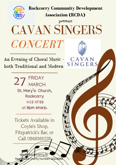Remember the date, folks! Friday March 27th – the date the Cavan Singers are coming to St. Mary’s Church, Corravacan, Rockcorry. Hosted by Rockcorry Community Development Association (RCDA), the Choir will present ‘An Evening of Choral Music both Traditional and Modern ’.